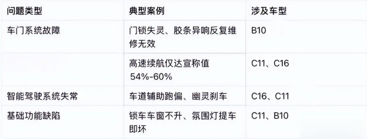 上市即热销的C16则深陷“通病门”。一位提车20天的车主投诉,车辆时速达90公里时电机发出高频啸叫,半坡起步时噪音更大,全家人耳膜都受到刺激。当他前往4S店维权时,却得到“这是通病”的回复,且厂家两周内都未给出解决方案。从“最快交付破万”的B01到累计销量27万台的C11,虽暂无集中投诉,但在“低价高配”的成本压力下,品控一致性已成为消费者担忧的问题。