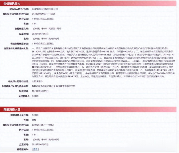 但就在同一天,广州市白云区人民法院的一纸文书,给零跑的光辉形象蒙上了一层阴影。零跑及其子公司凌跑汽车商贸被列为失信被执行人,朱江明也被限制乘坐飞机、高铁一等座等高消费行为。原来,这是一起标的仅361.81万元的合同纠纷。零跑子公司与广州首汽的债务纠纷此前已通过调解书解决,约定2024年6月27日前付款,并在三个月内完成73辆汽车过户,但直到2025年9月,过户仍未完成。